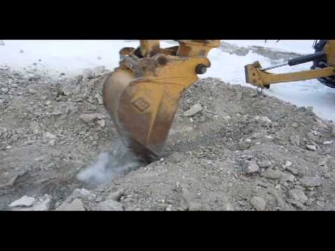 A backhoe scrapes at the frozen ground in Dawson City, Yukon. City workers have to repair water line breaks frequently over the winter, as the permafrost shifts. This ground is only sand and gravel, but in the exteme temperatures of a Klondike Winter it is almost as hard as concrete. The teeth on the buckets usually only last for a few days of this kind of work before they must be replaced. At the time I took this picture, it was minus 50 in town, making us the coldest place on earth according to the Weather Extreme website.